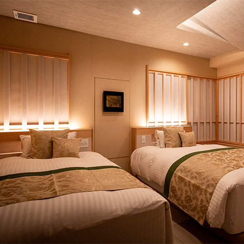 広いリビングルームを挟んでツインのベッドルームと和室がある造りとなっておりますのでお二人ではもちろん、2世帯やファミリーなどグループのご利用にもおすすめです。