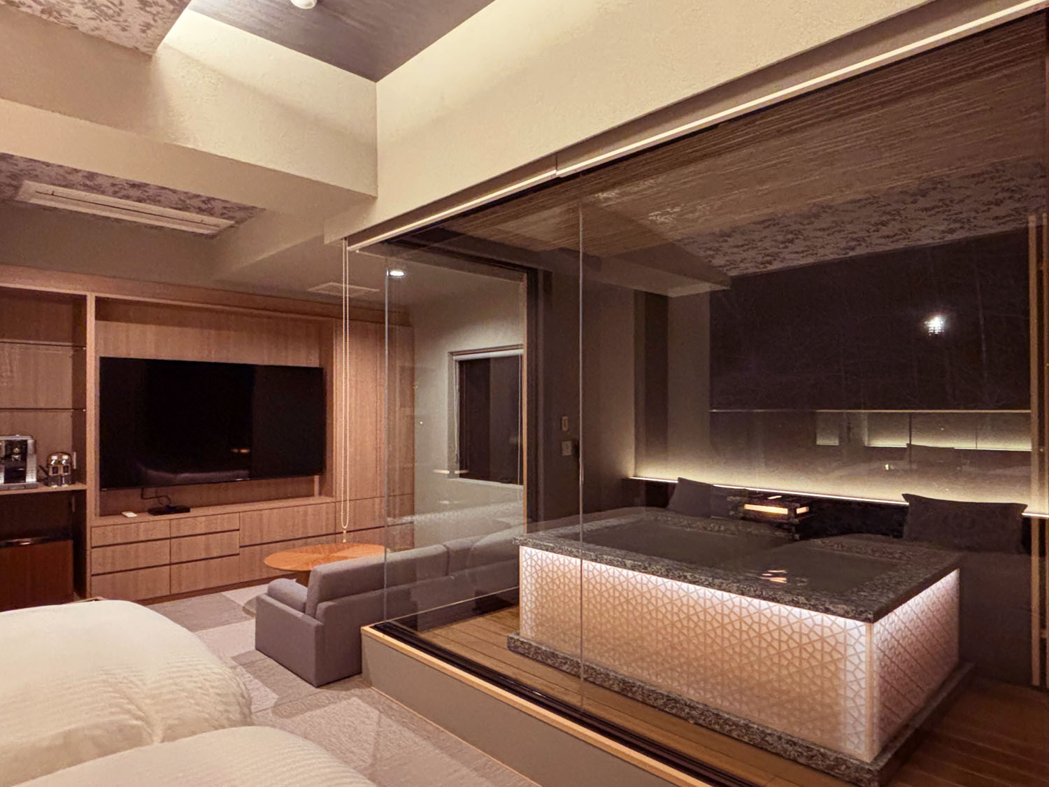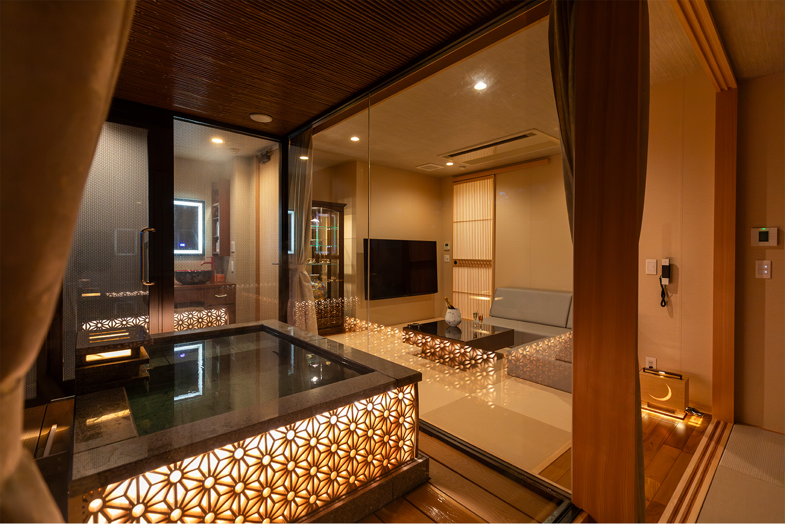 露天風呂と2ベッドルーム、和室が備わった和洋室。