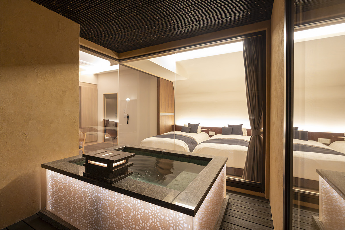 自家源泉掛け流しの露天風呂がすべての客室に備わった最上階特別フロア「六花」。 お部屋ごとに趣の異なる空間が訪れるお客様を非日常空間へ誘います。